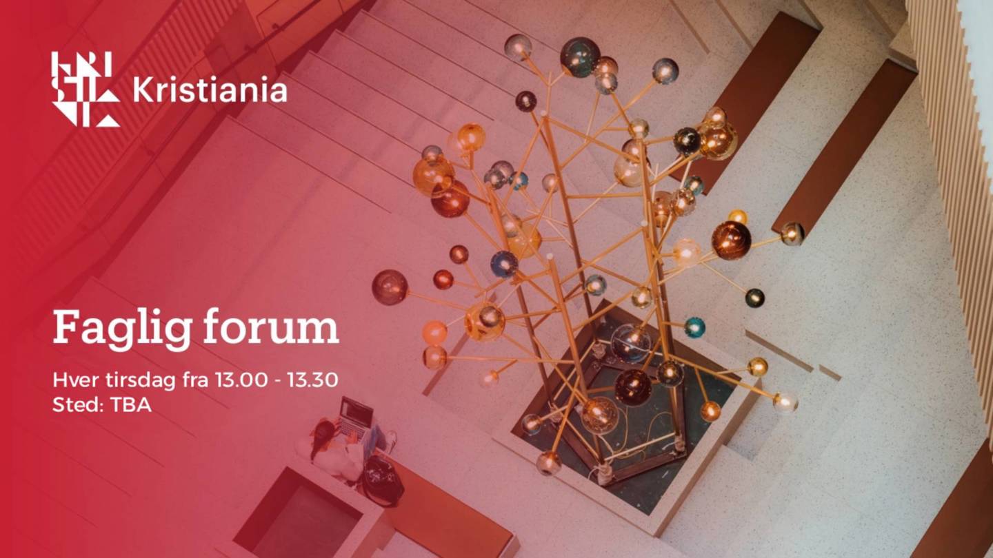 TBA13.00 - 13.30Faglig forum arrangeres som ukentlige seminarer hver tirsdag. Forskere og fagansatte ved School of Communication, Leadership and Management presenterer noe de nylig har jobbet med, noe de jobber med nå, eller om dagsaktuelle temaer som de ha kunnskap om.
