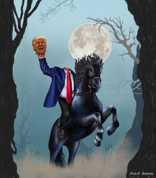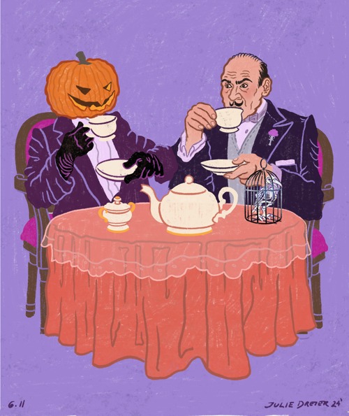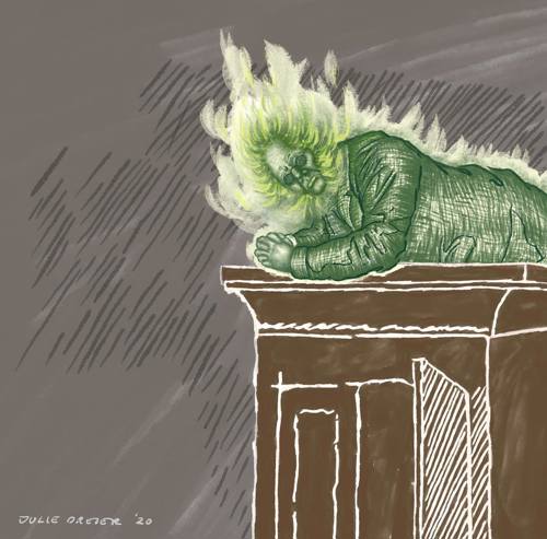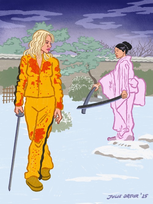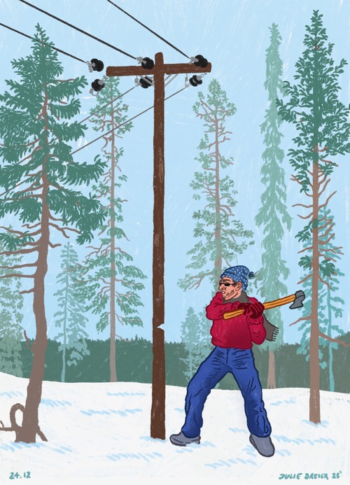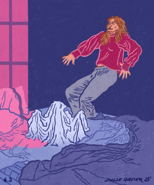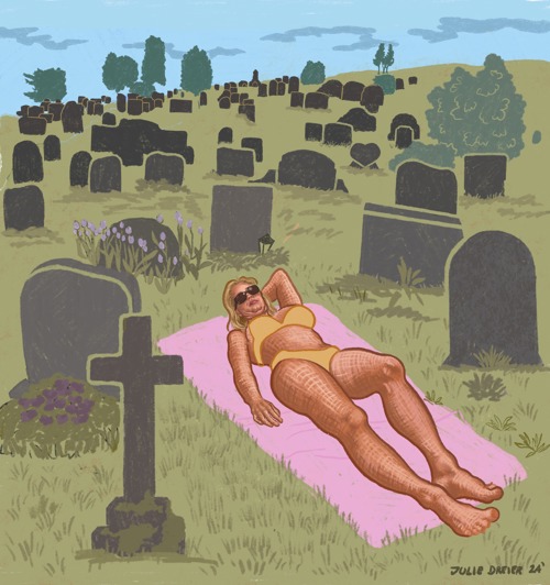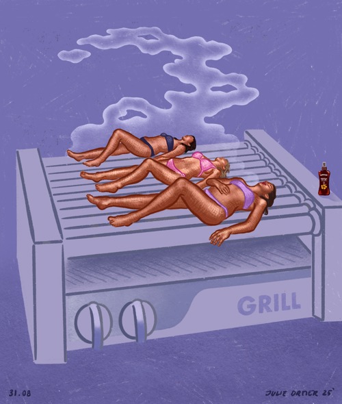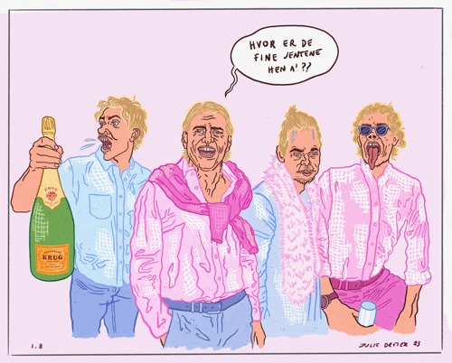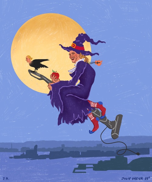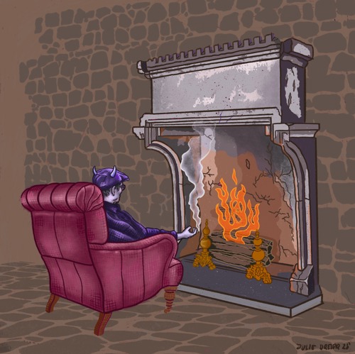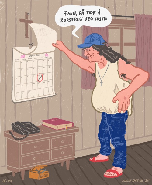 Selv om arbeidsdagen er fylt med digitale flater og brukerflyt, finner Julie kreativt utløp på en helt annen måte på fritiden. Hun har alltid vært glad i satirisk tegning, og henter inspirasjon fra politikk, samfunn, myter, filmer og sosiale fenomener hun vil kritisere.