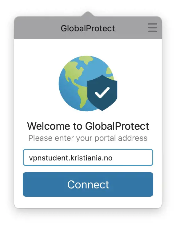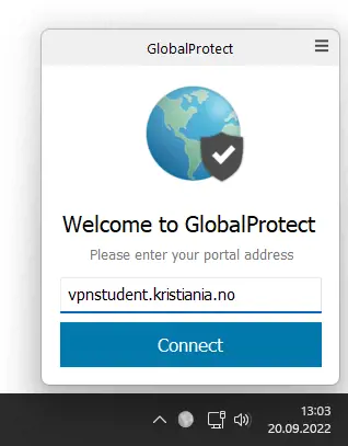 - You should then see a small window titled “Welcome to GlobalProtect.” In the Portal Address field, enter vpnstudent.kristiania.no, and then click “Connect.”