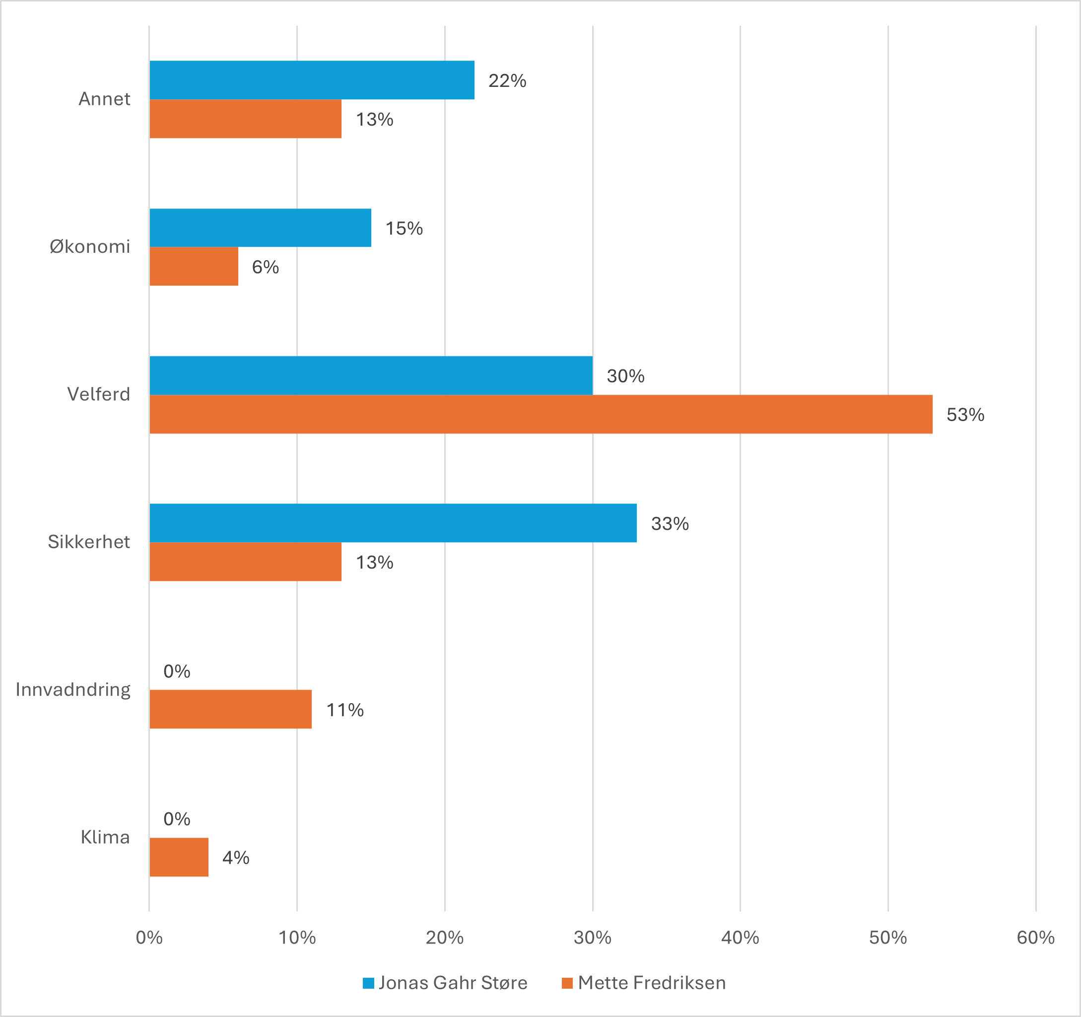 Figur 2 viser enda klarere hvor valgkampene skilte lag. Hos Frederiksen dominerte velferd med 53 prosent av postene. Hos Støre var innspurten mer delt mellom sikkerhet med 33 prosent og velferd med 30 prosent, mens økonomi og annet spilte mindre roller.