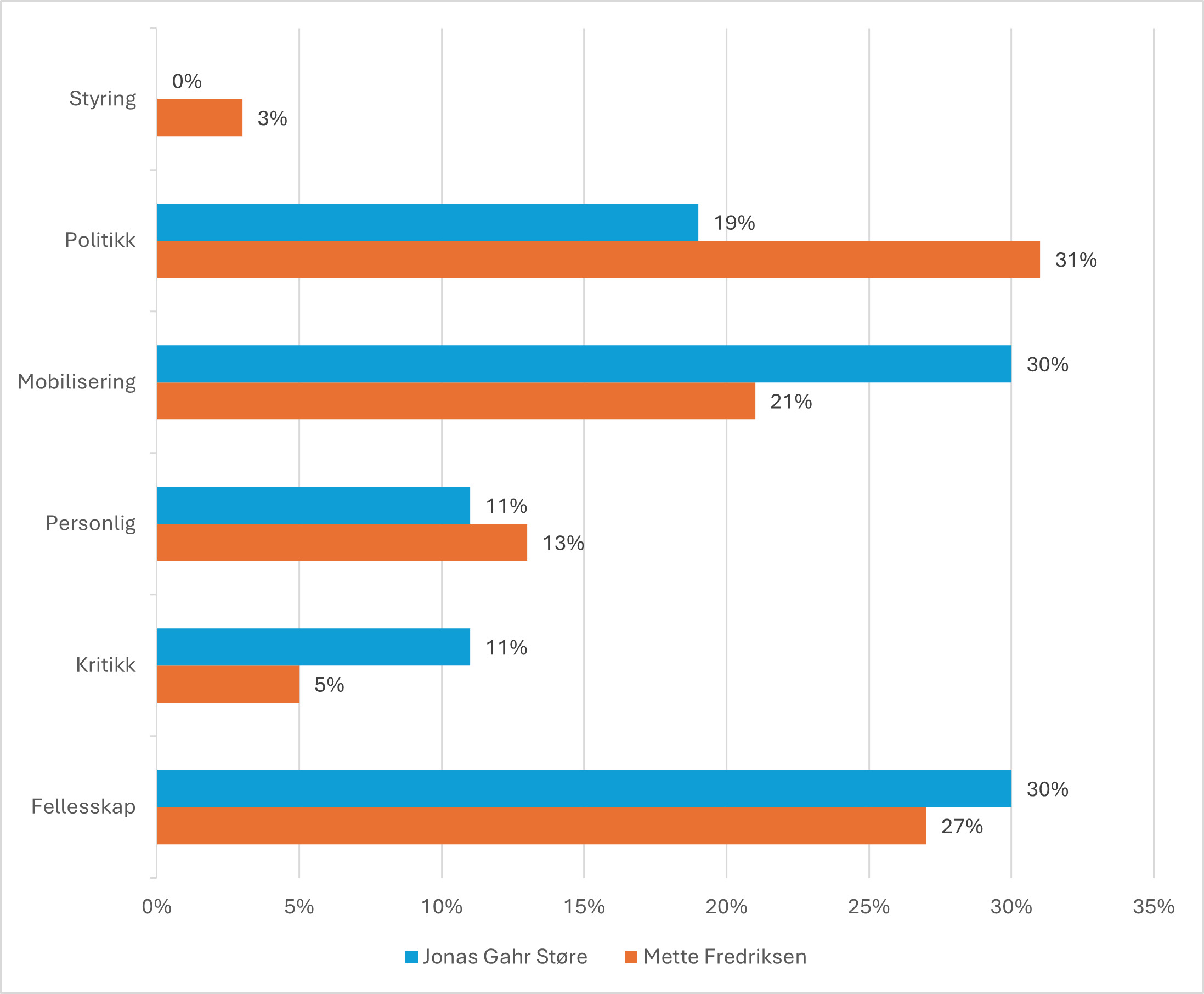 Det som først peker seg ut i figur 1, er at de to valgkampene brukte Facebook ulikt. Hos Frederiksen var politikk den klart største kategorien med 31 prosent, fulgt av fellesskap med 27 prosent og mobilisering med 21 prosent. Hos Støre var bildet annerledes: mobilisering og fellesskap var like store, begge på 30 prosent, mens politikk utgjorde 19 prosent.