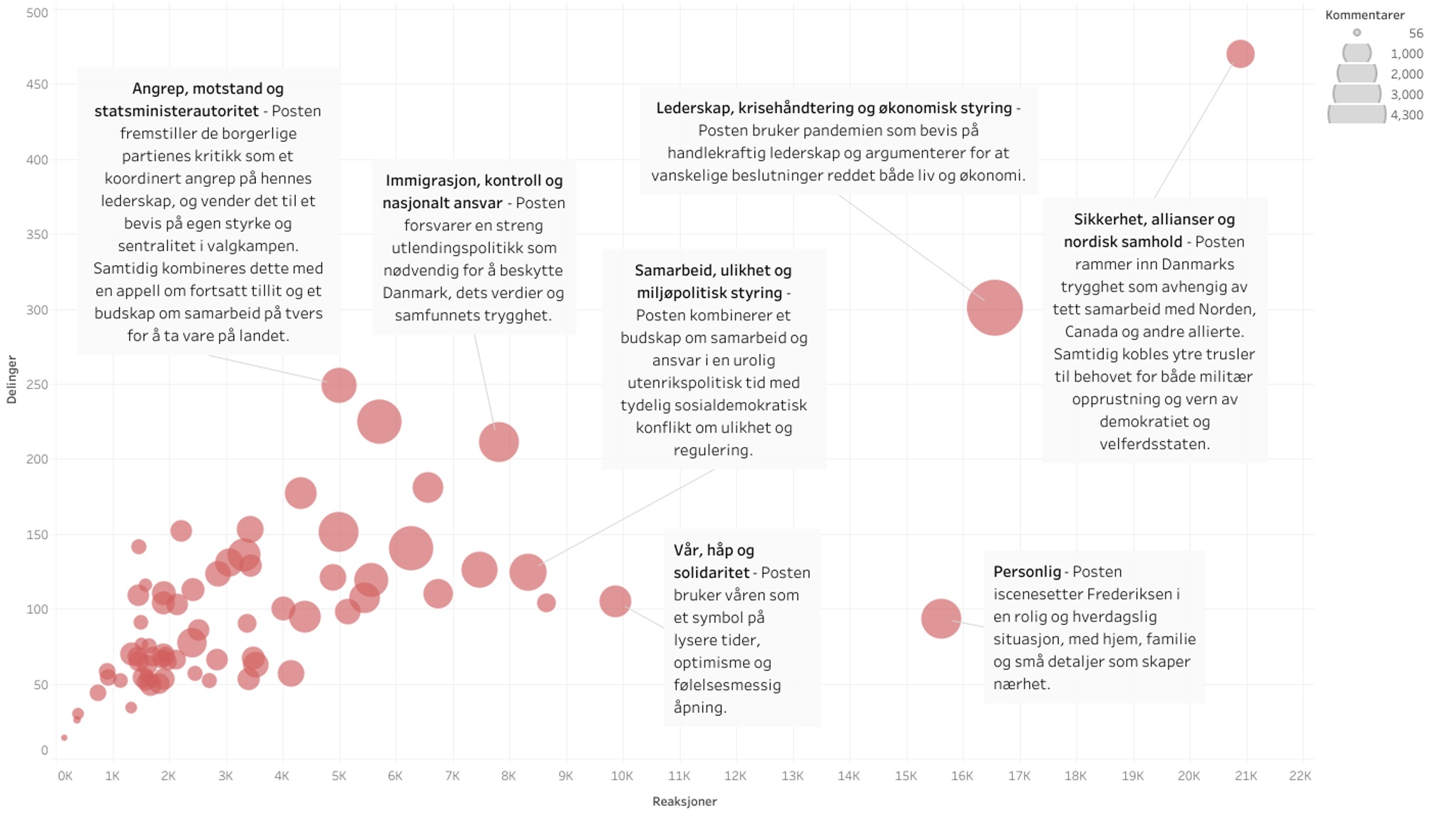 Resultatene peker i en tydelig retning. Det var ikke organisatoriske poster eller innlegg om kampanjelogistikk som fikk størst gjennomslag. Det som nådde bredest ut, var innlegg som rammet inn valgkampen som et spørsmål om trygghet, økonomi, sikkerhet, demokratisk fellesskap og hvem som kunne styre Danmark i en urolig tid.