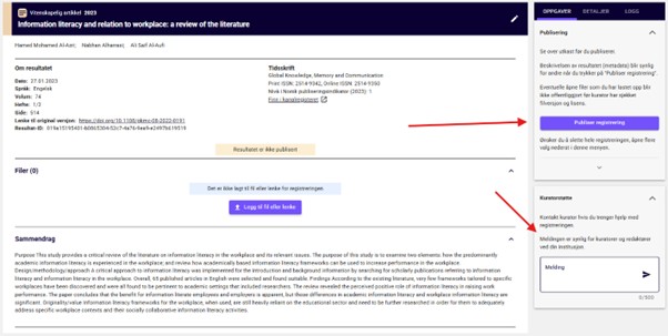 - Velg "Publiser registrering" for å publisere posten (figur 12). Filen vil gå til godkjenning, men resten blir publisert som vanlig.