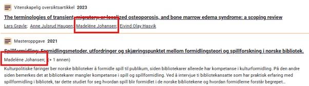 Hvis et resultat mangler på din forskerprofil, kan det være registrert uten at du er identifisert som bidragsyter, eller fordi posten er ukomplett. Søk opp resultatet eller ditt navn, og se om navnet ditt er understreket (figur 1).