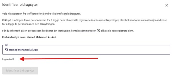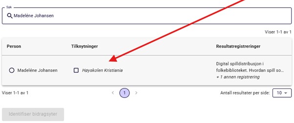 - Identifiser bidragsyteren ved å klikke på «Identifiser bidragsyter». Dette knytter resultatet til forskerprofilen i NVA.