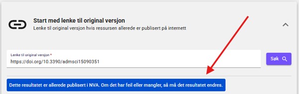 Hvis resultatet kun er publisert fysisk, eller NVA ikke finner resultatet (figur 2), registrer resultatet manuelt. Hvis resultatet allerede er registrert, får du beskjed (figur 3). Ved manuell registrering kan du laste opp filen først eller starte med tomt skjema. Stegene er de samme som ved DOI/lenke, men ingenting er forhåndsutfylt.