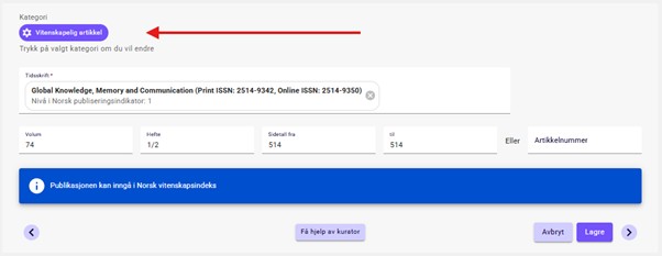 - Om du startet registrering med lenke/DOI, så skal NVA ha foreslått en kategori for deg. Dobbelsjekk at den er riktig, om ikke riktig, så kan du endre den ved å trykke på kateogiren (figur 6). Da vil et vindu åpne seg med alle tilgjenglige kategorier i NVA. Om du startet registreringen med et tomt skjema, så vil du se alle valgene når du først går til kategorifanen. De vitenskapelige kategoriene som gir NVI uttelling har en blomst på seg.