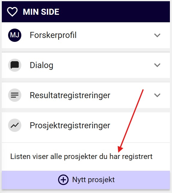 - For å registrere et prosjekt, gå til "Min side", deretter velger du "Prosjektregistreringer". Klikk på knappen "Nytt prosjekt" (figur 2). Du vil få to valg, som er gjort rede for under.