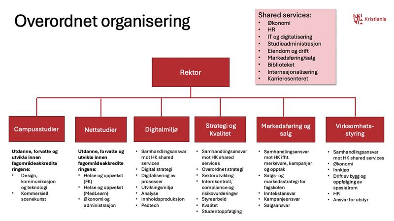 Det vedtatte organisasjonskartet av Fagskolen Kristiania etter integrasjon med NKI Fagskole og MedLearn: