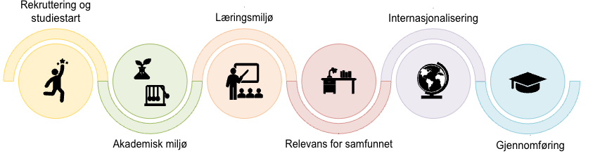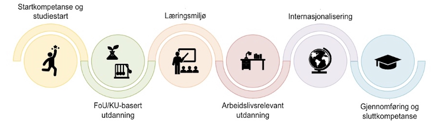 Nedenfor beskrives disse seks områdene for utdanningskvalitet for syklus 1 og 2, med tilhørende delområder, hver for seg. Figuren under viser sammenhengen mellom disse seks kvalitetsområdene, samt hvordan de flettes sammen og integreres i studentens studieløp fra oppstart som student til uteksaminert kandidat: